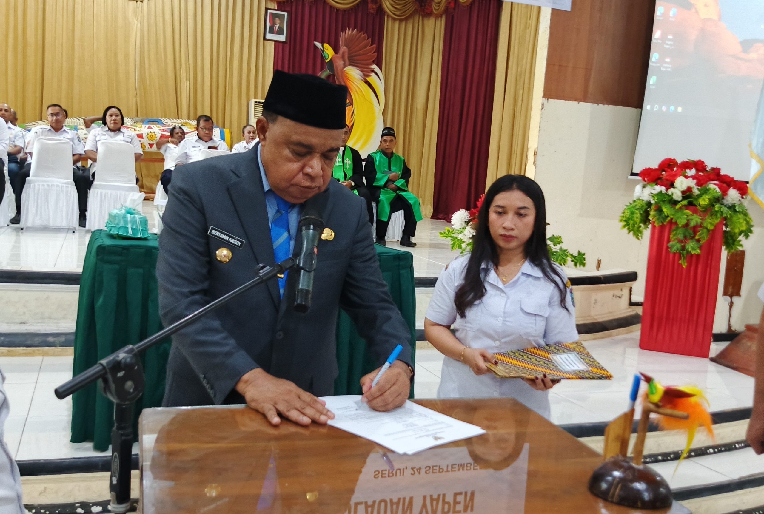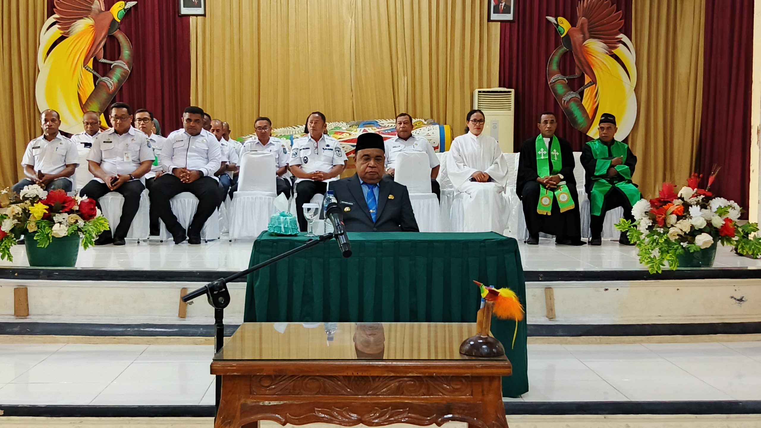 Bupati Kepulauan Yapen, Benyamin Arisoy, dalam sambutannya menyampaikan ucapan selamat kepada para CPNS dan PPPK yang telah resmi mengemban amanah sebagai aparatur negara. Ia menegaskan bahwa sumpah/janji yang diucapkan bukan sekadar formalitas, melainkan ikrar suci kepada Tuhan dan tanggung jawab besar sebagai abdi negara dan masyarakat.