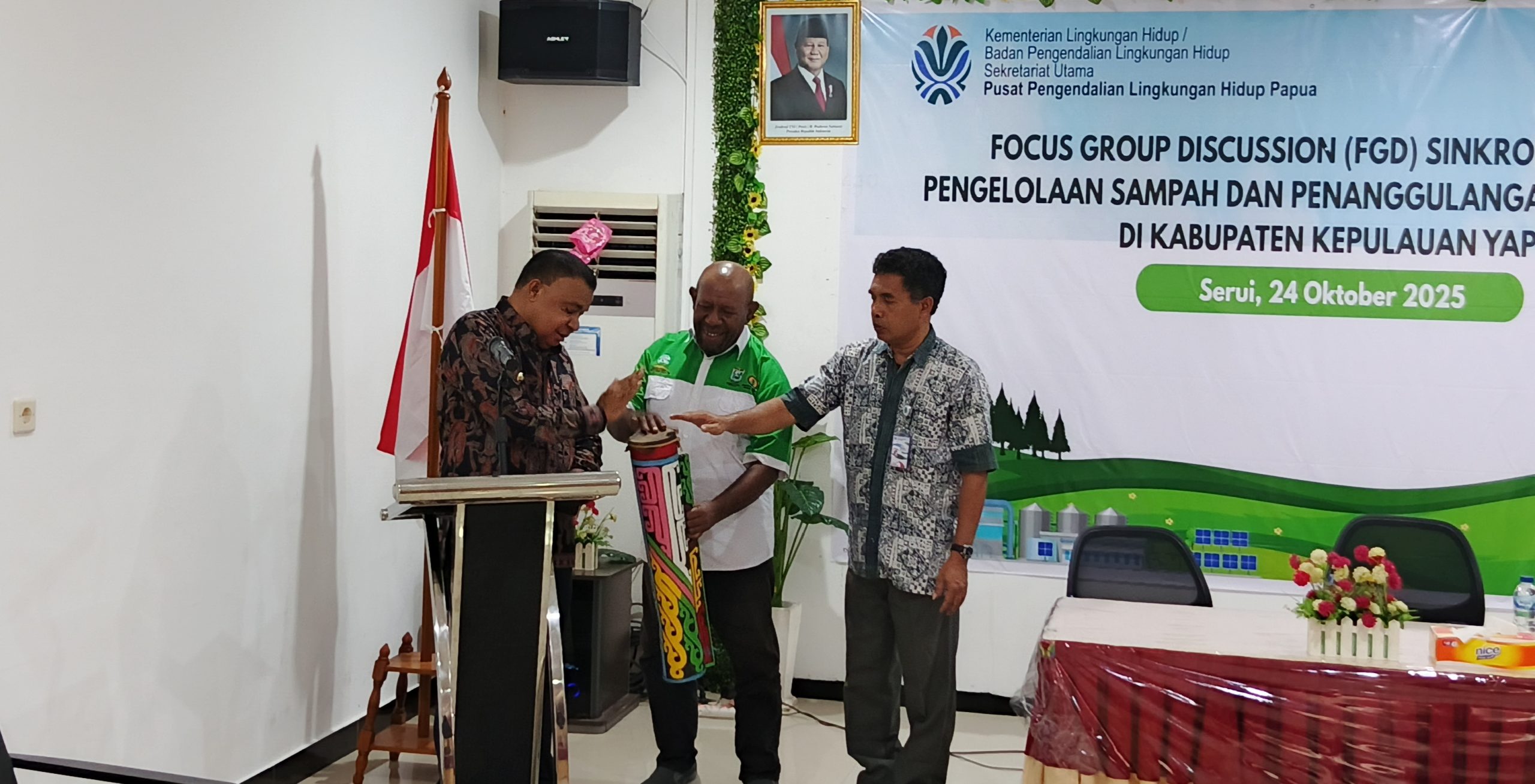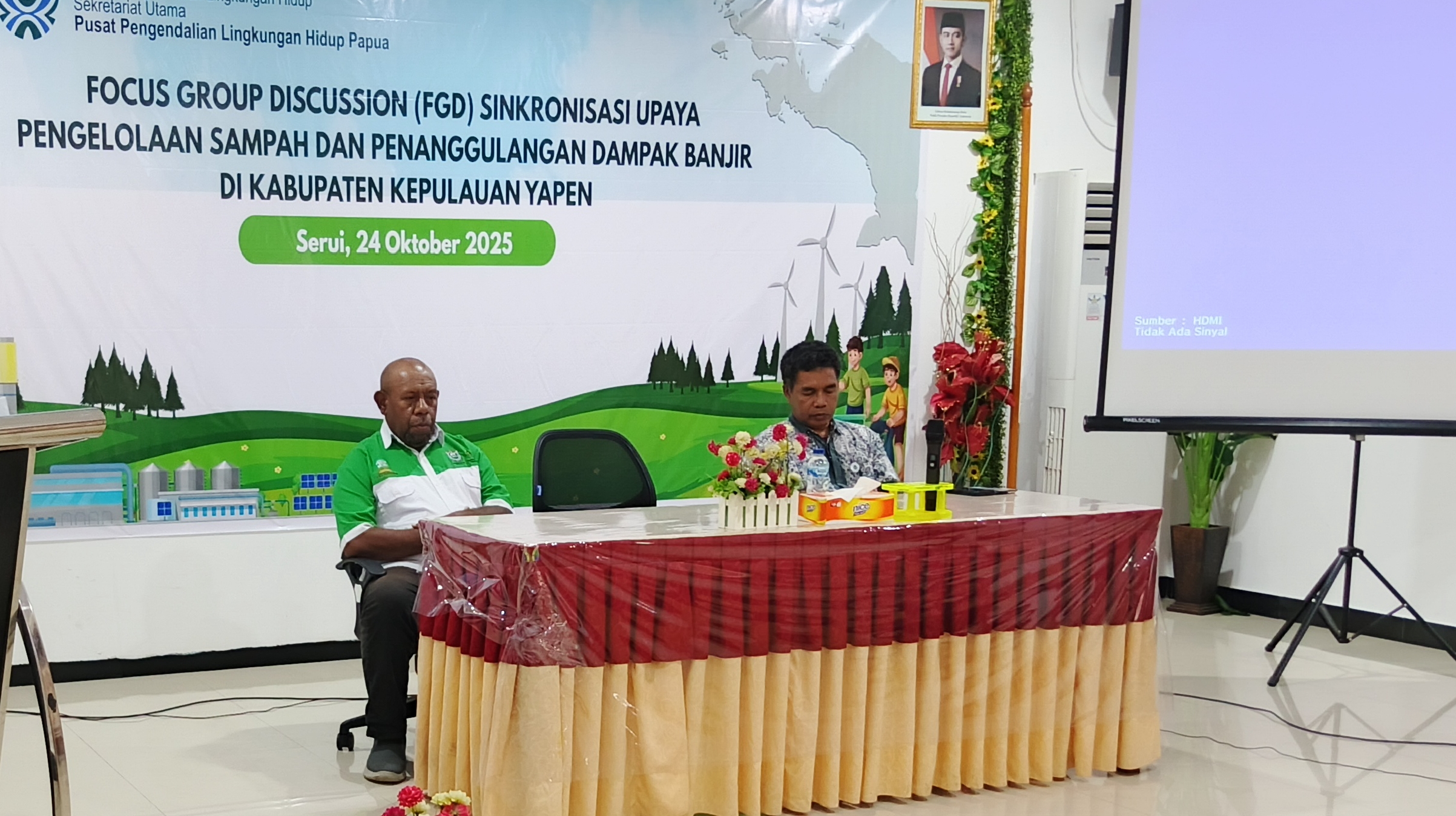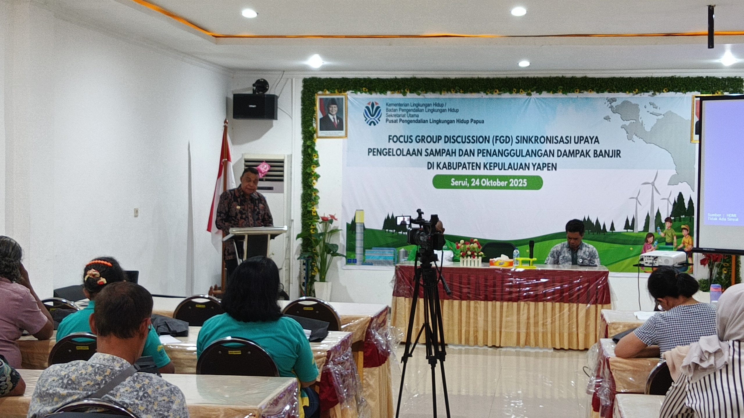 Prokopim Setda — Pemerintah Kabupaten Kepulauan Yapen bersama Kementerian Lingkungan Hidup / Badan Pengendalian Lingkungan Hidup Sekretariat Utama melalui Pusat Pengendalian Lingkungan Hidup Papua menggelar Focus Group Discussion (FGD) bertema “Sinkronisasi Upaya Pengelolaan Sampah dan Penanggulangan Dampak Banjir” di Hotel Merpati, Jumat (24/10/2025).