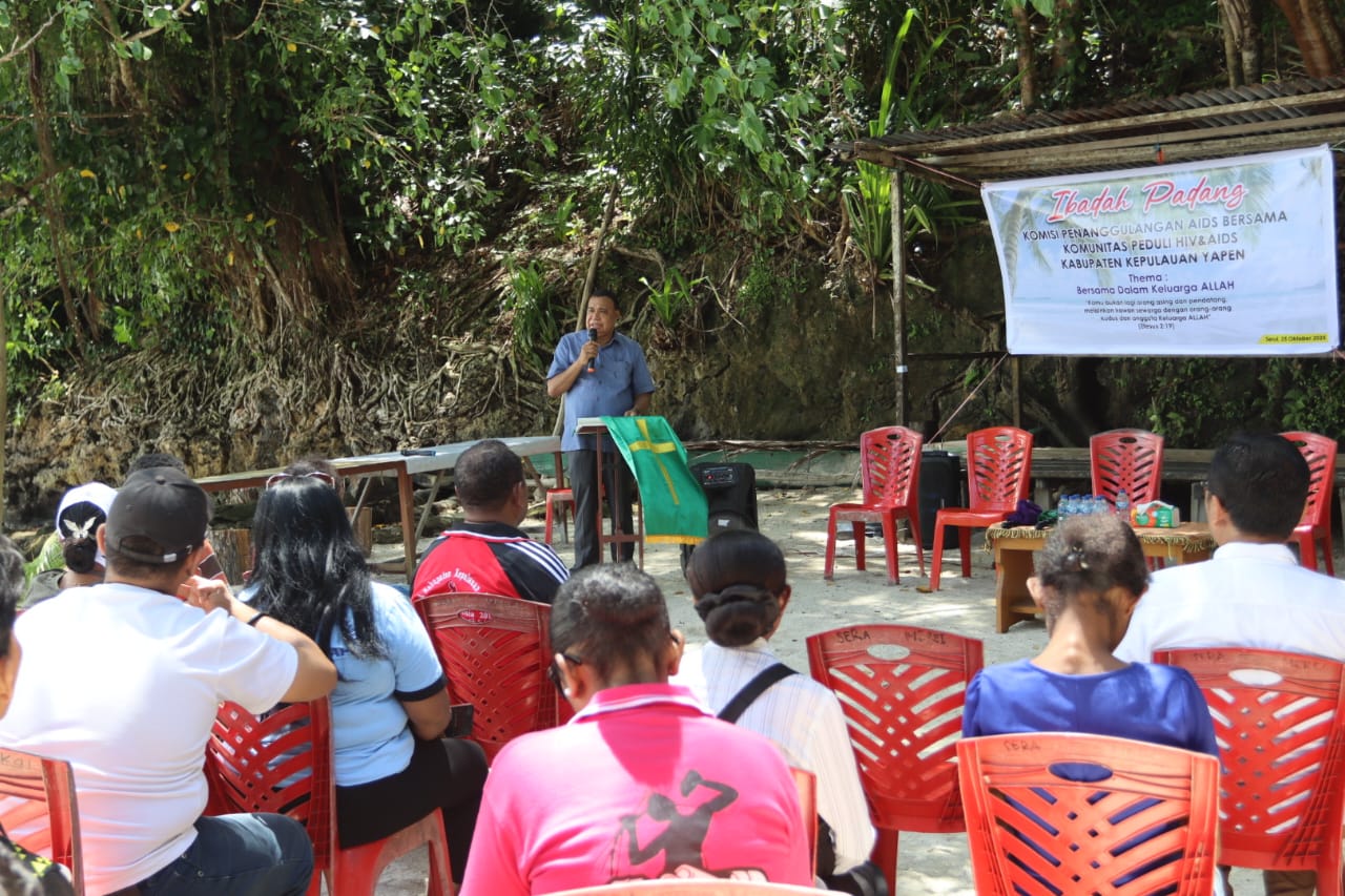 Serui – Sebagai bentuk rasa kepedulian terhadap para ODHA, Bupati Kabupaten Kepulauan Yapen Benyamin Arisoy, SE, M.Si menghadiri kegiatan ibadah padang Komisi Penanggulangan AIDS bersama komunitas peduli HIV / AIDS Kabupaten Kepulauan Yapen dengan tema “Bersama Dengan Keluarga Allah” dan menyerahkan bingkisan kepada ODHA. Bertempat di pantai Minggaf, Sabtu (25/10/25).