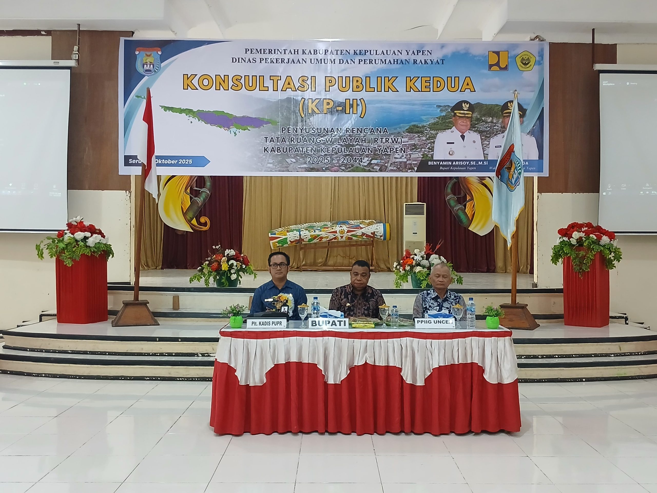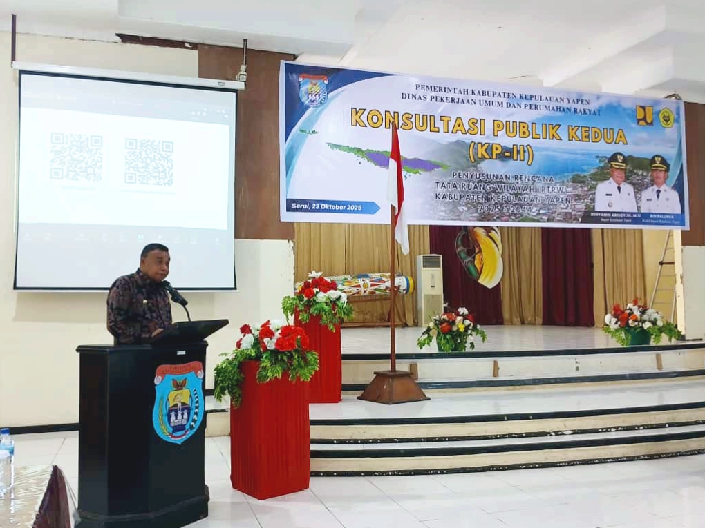 Prokopim Setda — Pemerintah Kabupaten Kepulauan Yapen melalui Dinas Pekerjaan Umum dan Perumahan Rakyat (PUPR) melanjutkan Hari Kedua Konsultasi Publik II (KP-II) penyusunan Revisi Rencana Tata Ruang Wilayah (RTRW) Kabupaten Kepulauan Yapen Tahun 2025–2044, bertempat di Gedung Silas Papare, Serui, Jumat (24/10/2025).