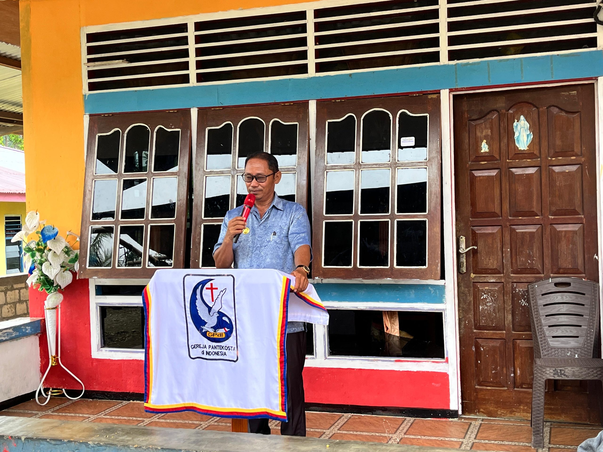 Wakil Bupati Kepulauan Yapen, Roi Palunga memberikan sambutannya di saksikan Majelis Daerah, Majelis Wilayah Gereja Pantekosta di Indonesia (GPdI), panitia pembangunan, dan Gembala GPdI El Gibbor.