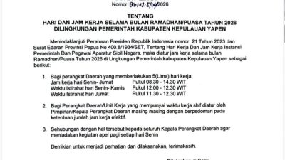 Serui – Pemerintah Kabupaten Kepulauan Yapen resmi mengatur hari dan jam kerja Aparatur Sipil Negara (ASN) selama bulan Ramadan/Puasa Tahun 2026. Ketentuan tersebut tertuang dalam Surat Edaran Bupati Nomor 800-1-12-5/04/2026…