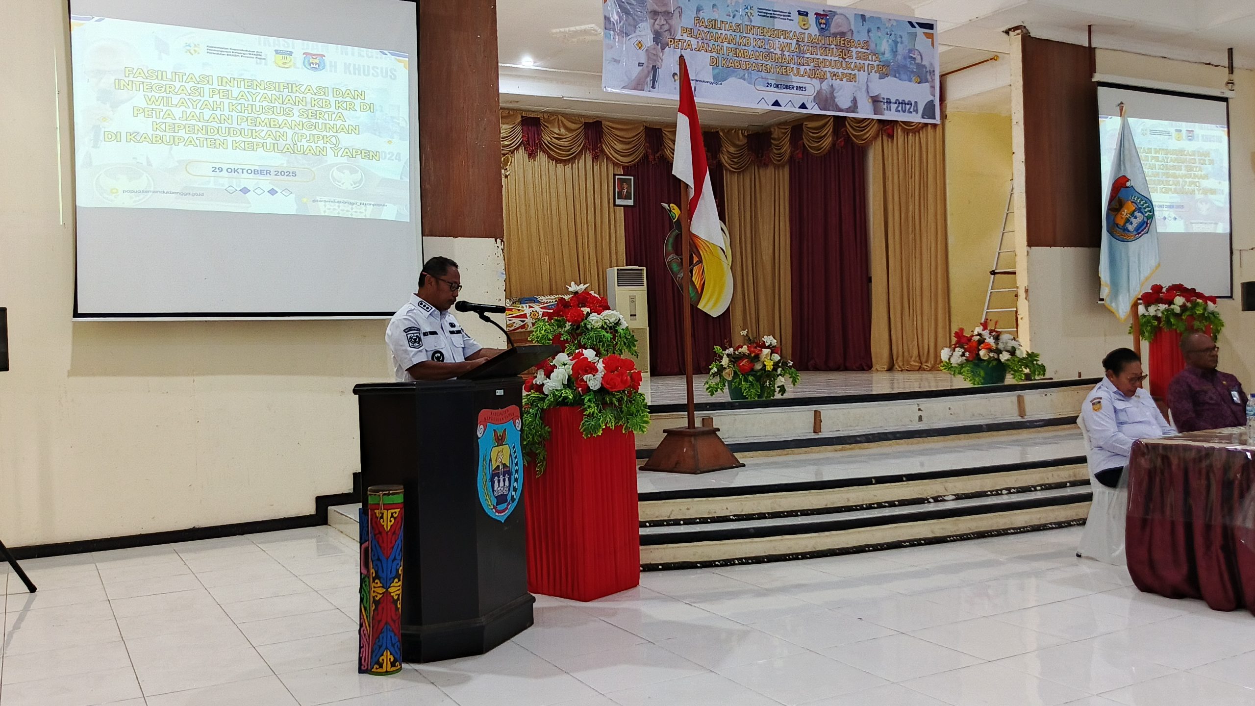 Prokopim Setda — Wakil Bupati Kepulauan Yapen, Roi Palunga secara resmi membuka kegiatan Intensifikasi dan Integrasi Pelayanan Keluarga Berencana dan Kesehatan Reproduksi (KBKR) di Wilayah Khusus, serta Penyusunan Peta Jalan Pembangunan Kependudukan (PJPK) Tahun 2025–2029, yang berlangsung di Gedung Silas Papare, Rabu (29/10/2025).