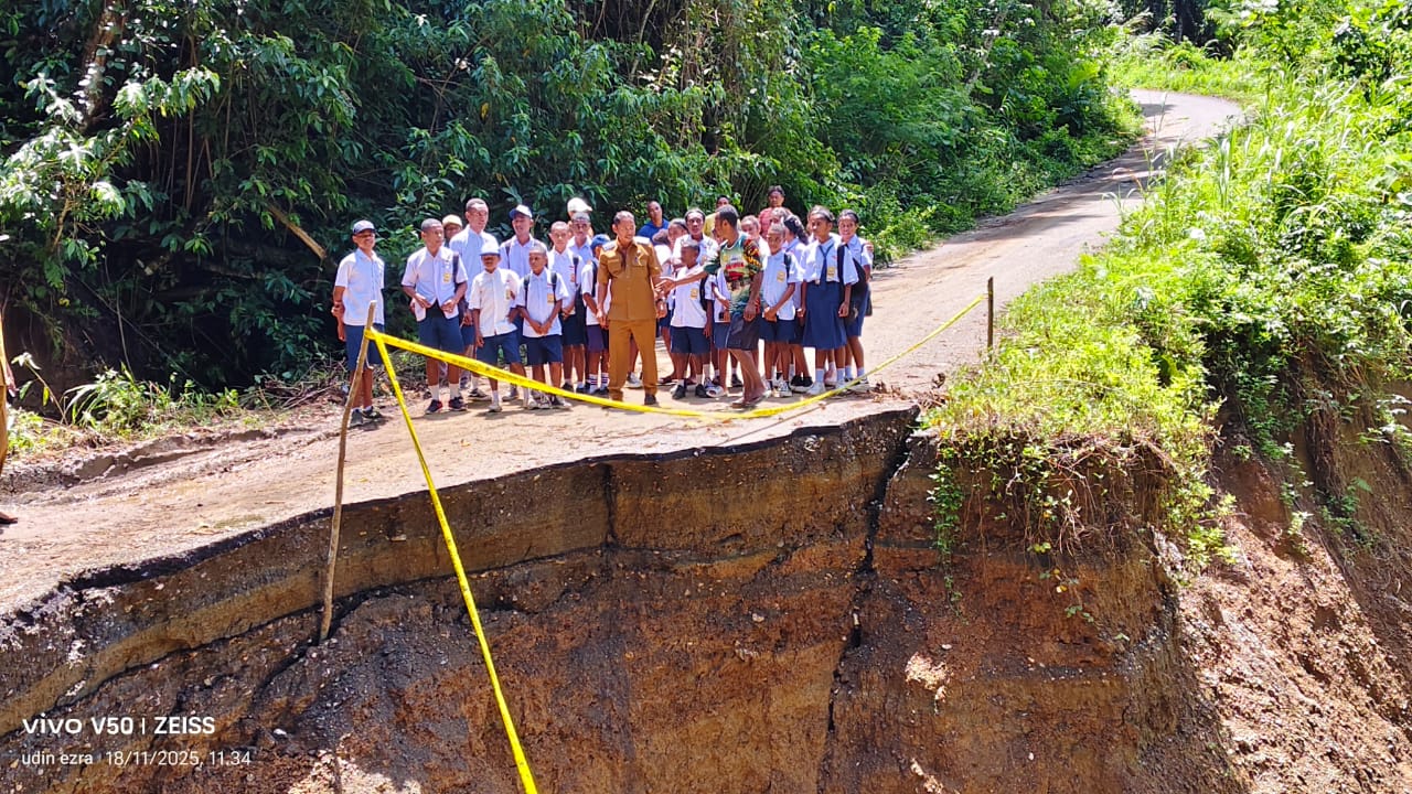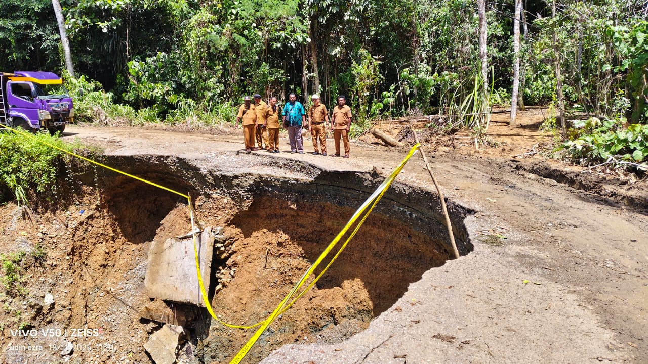 Wakil Bupati Kepulauan Yapen Roi Palunga bersama Plt Kepala Dinas Pekerjaan Umum Perumahan Rakyat (PUPR) Kepulauan Yapen Jumirto Dwi Bongga, serta jajaran teknis PUPR, meninjau langsung lokasi putusnya jalan Serui–Wadapi akibat longsor di Distrik Angkaisera, Selasa (18/11/2025) kemarin.