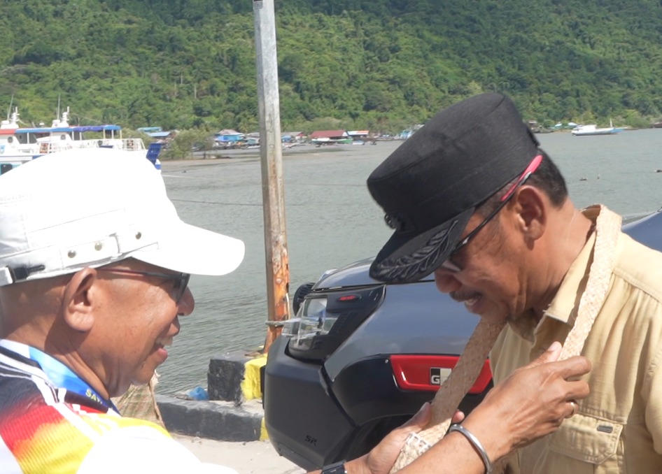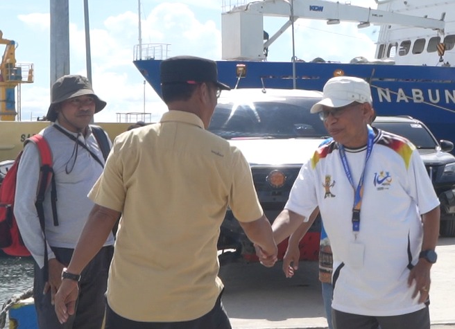 Wakil Bupati Roi Palunga bersama Ketua DPRK Kepulauan Yapen, Ebzon Sembai, tiba dan disambut hangat oleh panitia ditandai pengalungan noken.