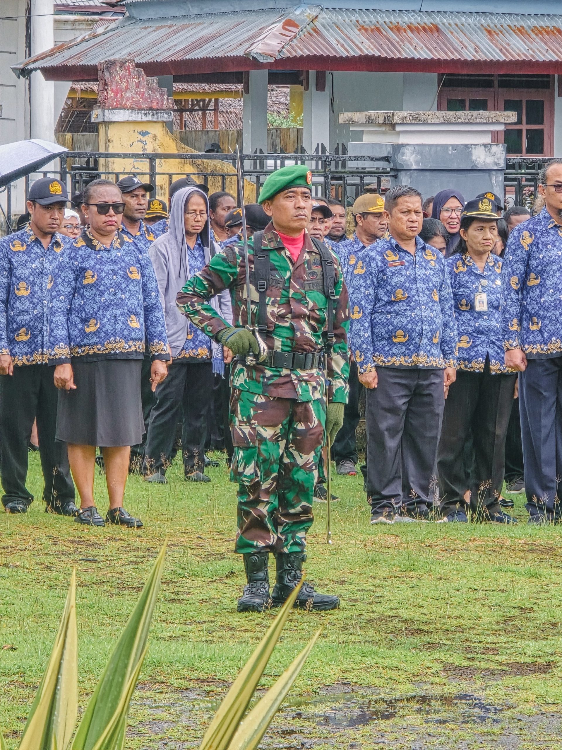 Di halaman kantor Bupati Kepulauan Yapen, ratusan peserta tetap berdiri tegak dengan pakaian yang mulai basah, sementara bendera merah putih berkibar gagah di tengah langit mendung.