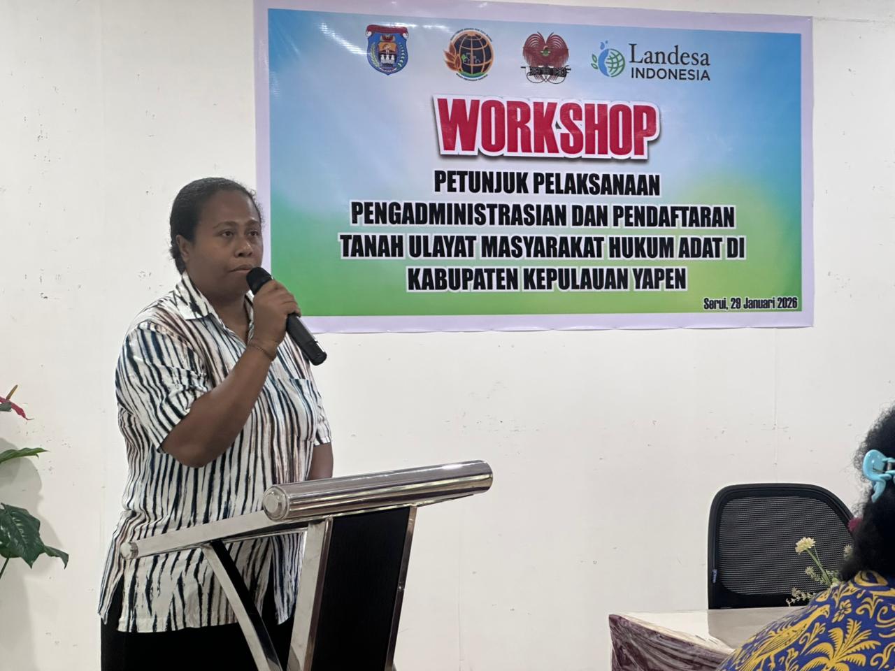 Wakil Bupati Kepulauan Yapen, Roi Palunga, dalam sambutannya menyampaikan bahwa Pemerintah Kabupaten Kepulauan Yapen menyambut baik dan memberikan apresiasi atas terselenggaranya workshop tersebut. Menurutnya, kegiatan ini memiliki arti penting dan strategis dalam upaya memberikan kepastian hukum serta perlindungan negara terhadap hak-hak tanah adat.